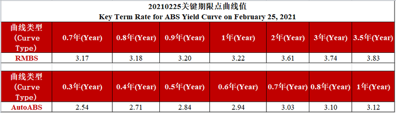 中债资信资产支持证券收益率曲线体系主要包括RMBS收益率曲线和汽车贷收益率曲线。RMBS收益率为市场首创,样本券包含市场主要RMBS发起机构如工行、建行、中行、农行等的产品。目前编制曲线的级别为中债资信AAA级,曲线类型为到期收益率曲线。编制方法为插值法。中债资信资产支持证券收益率曲线每工作日发布一次。