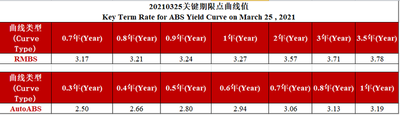 中债资信资产支持证券收益率曲线体系主要包括RMBS收益率曲线和汽车贷收益率曲线。RMBS收益率为市场首创,样本券包含市场主要RMBS发起机构如工行、建行、中行、农行等的产品。目前编制曲线的级别为中债资信AAA级,曲线类型为到期收益率曲线。编制方法为插值法。中债资信资产支持证券收益率曲线每工作日发布一次。