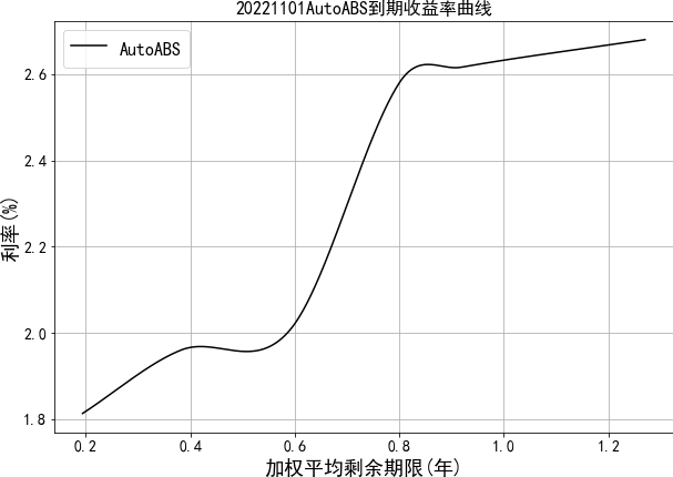 中债资信资产支持证券收益率曲线体系主要包括汽车贷收益率曲线。目前编制曲线的级别为中债资信AAA级,曲线类型为到期收益率曲线。编制方法为插值法。中债资信资产支持证券收益率曲线每工作日发布一次。