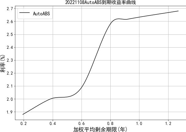 中债资信资产支持证券收益率曲线体系主要包括汽车贷收益率曲线。目前编制曲线的级别为中债资信AAA级,曲线类型为到期收益率曲线。编制方法为插值法。中债资信资产支持证券收益率曲线每工作日发布一次。